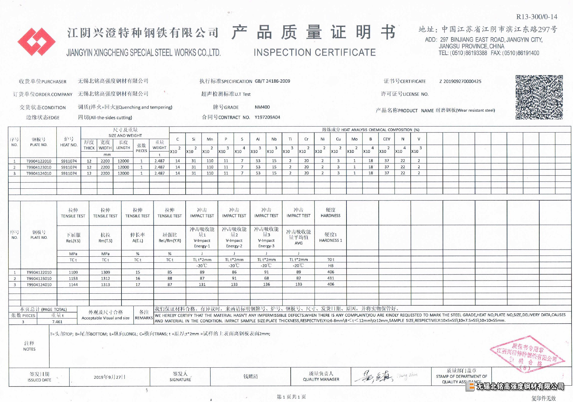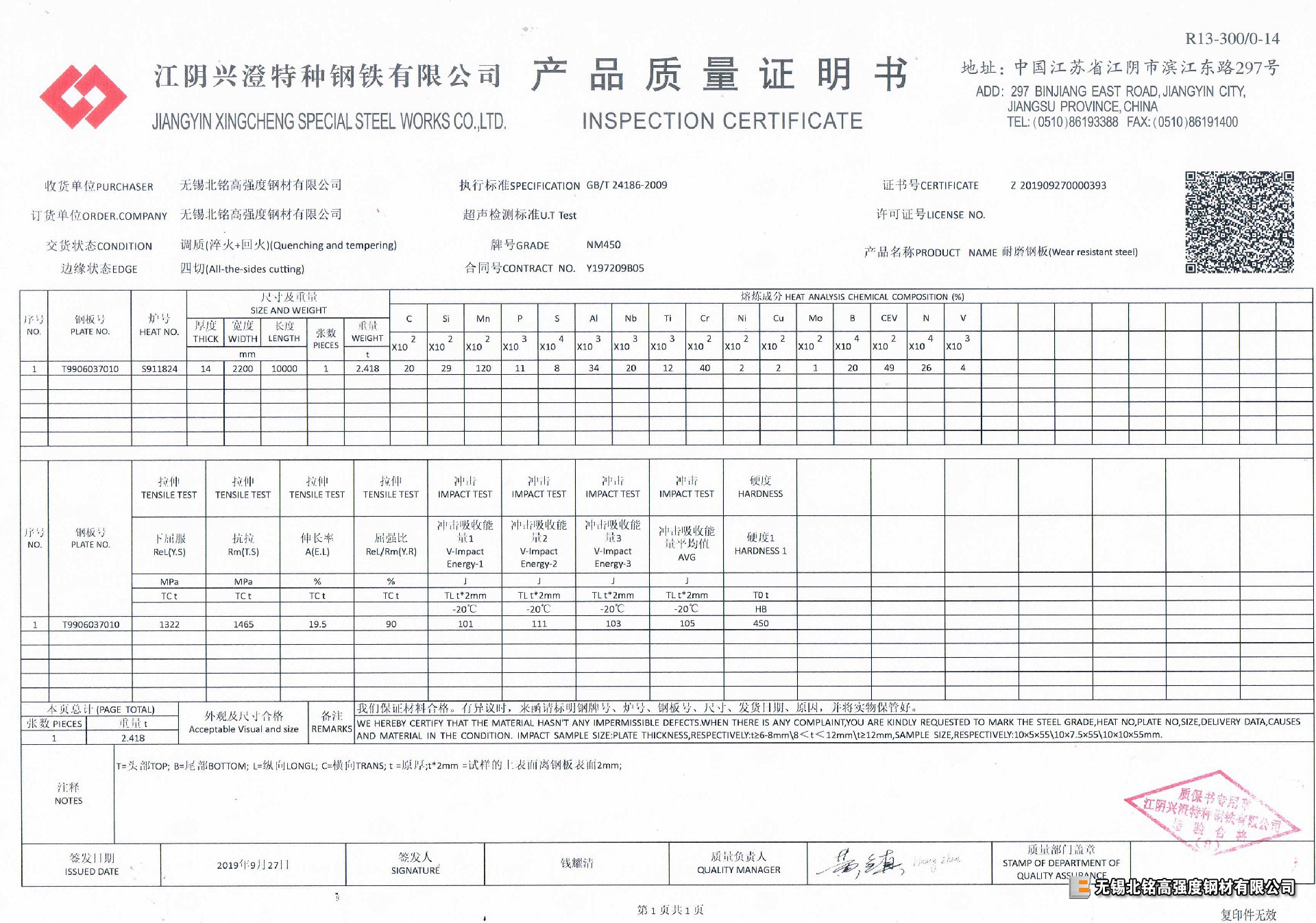 我司常備品種有NM360/NM400/NM450/NM500 規格范圍:3MM-100MM。部分規格可切割零售。主要產地為:興澄、新鋼、漣鋼