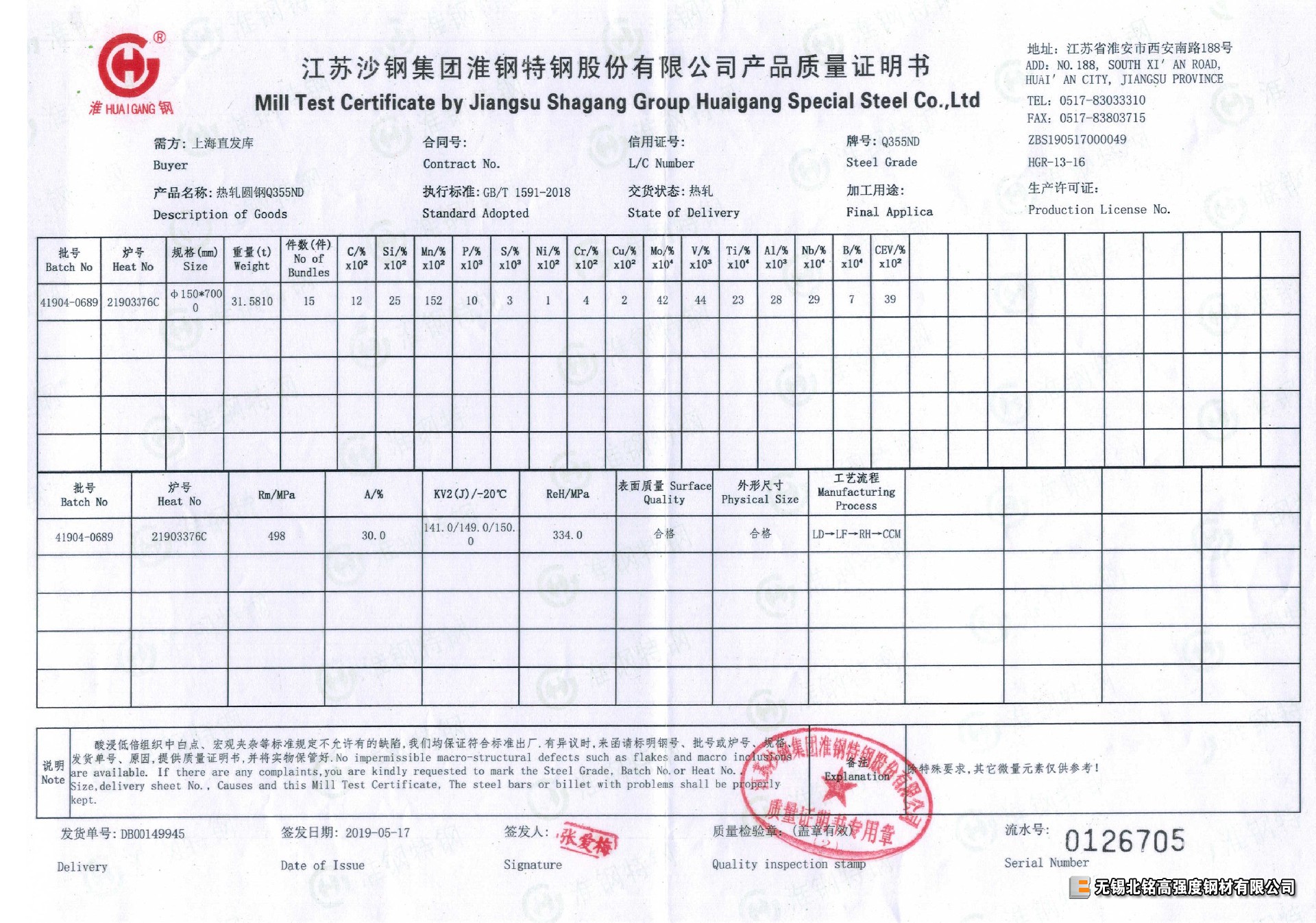 每支材料均有對應(yīng)爐批號鋼廠質(zhì)量證明書(質(zhì)保書),保證-20℃、-40℃ 低溫沖擊功值合格。